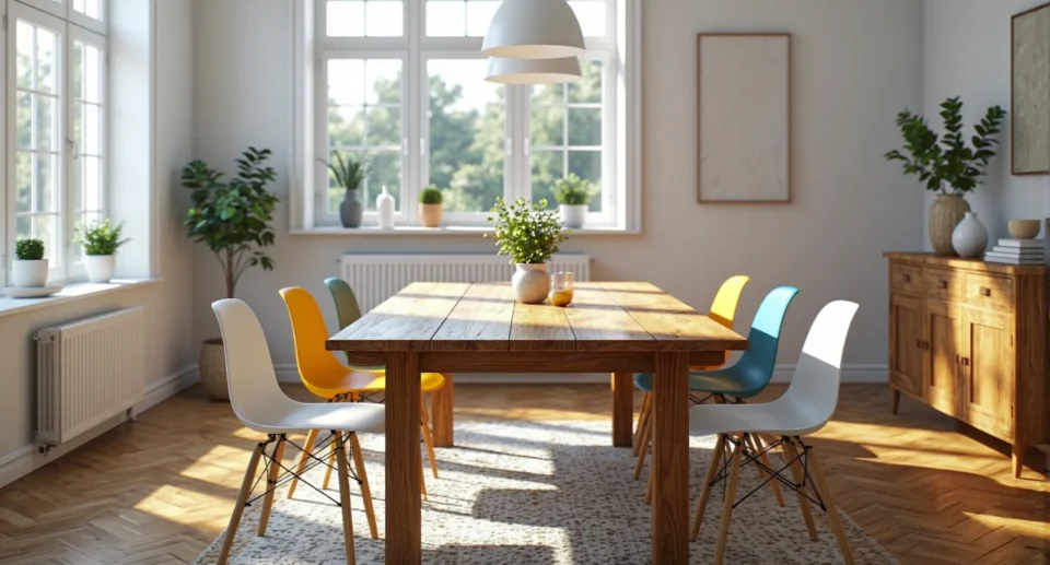 • Nad stołem w jadalni: Tutaj lampa może wisieć nieco niżej, ok. 70-80 cm nad blatem. Dzięki temu tworzy bardziej intymną atmosferę i nie przeszkadza w rozmowie osobom siedzącym naprzeciwko siebie.